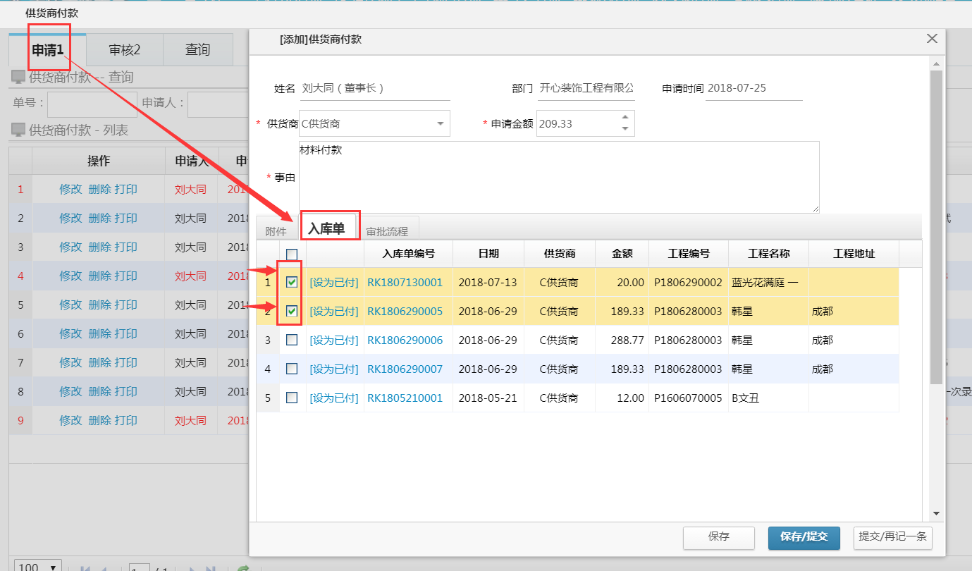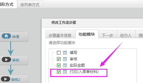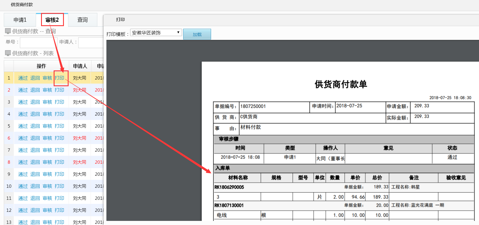 首先在工作流程中將【打印(入庫(kù)單材料)】此項(xiàng)功能選中,我們?cè)诠ぷ髋_(tái)---供貨商付款---打印才能顯示相關(guān)信息