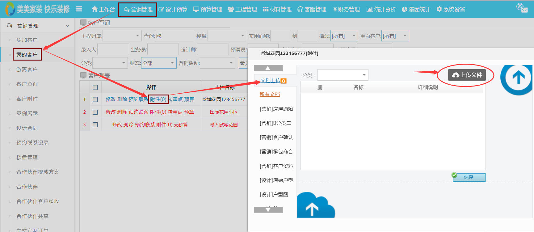 在營銷管理、設(shè)計(jì)預(yù)算中設(shè)計(jì)師和業(yè)務(wù)員均可將客戶的合同、設(shè)計(jì)圖等相關(guān)文件上傳至具體客戶文檔中且可批量上傳。批量上傳文件大大的節(jié)省了之前單個(gè)上傳